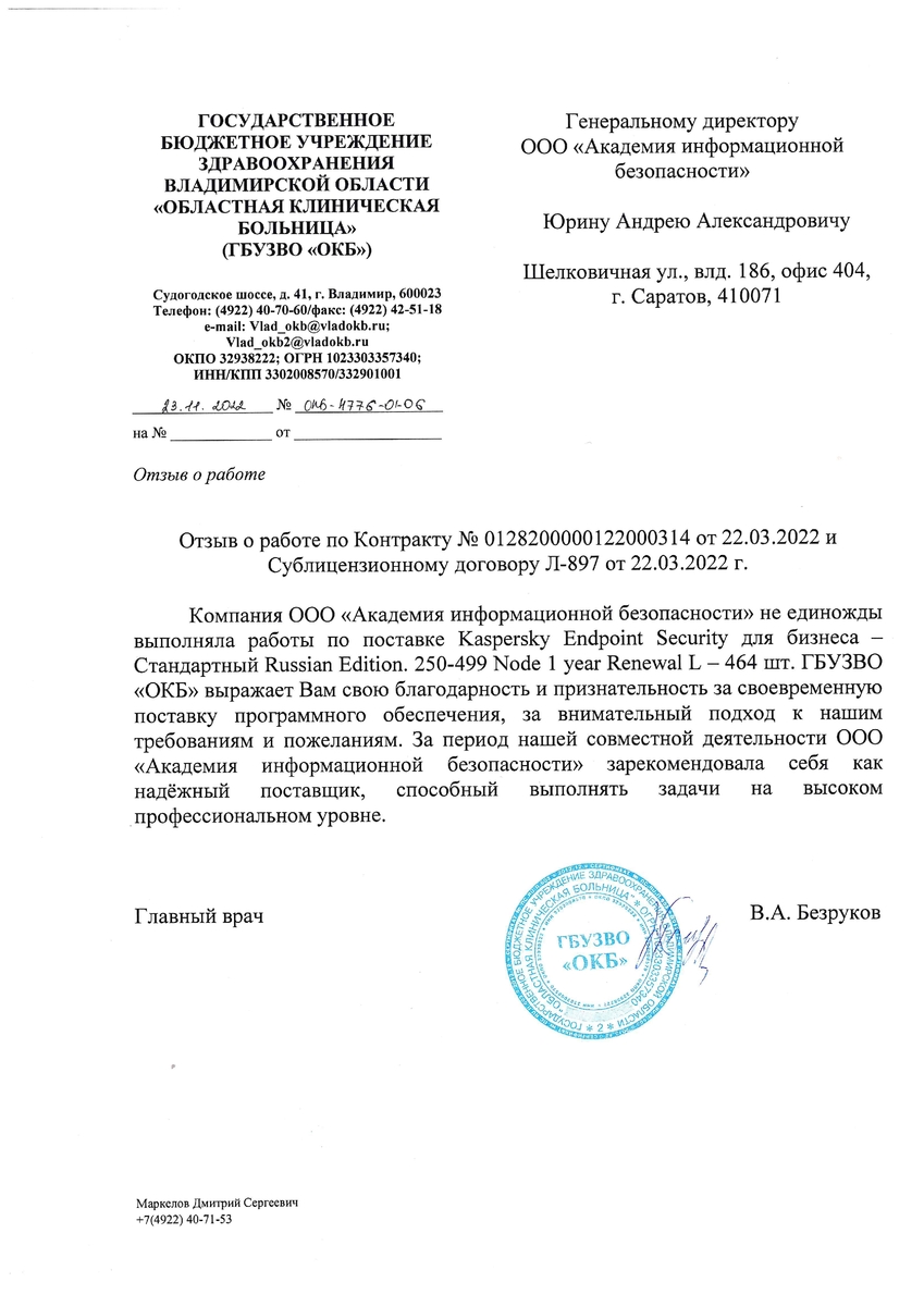 Компания ООО «Академия информационной безопасности» не единожды выполняла работы по поставке Kaspersky Endpoint Security для бизнеса – Стандартный Russian Edition. 250-499 Node 1 year Renewal L – 464 шт. ГБУЗВО «ОКБ» выражает Вам свою благодарность и признательность за своевременную поставку программного обеспечения, за внимательный подход к нашим требованиям и пожеланиям. За период нашей совместной деятельности ООО «Академия информационной безопасности» зарекомендовала себя как надёжный поставщик, способный выполнять задачи на высоком профессиональном уровне.